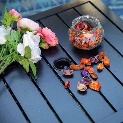 The small side table is made of steel. Matte powder-coated black finish frame, UV and fade resistant. Skid resistant feet for uneven ground and against floor scratching.