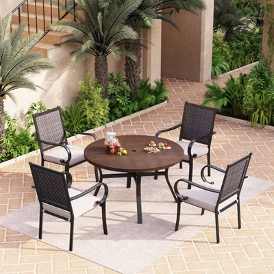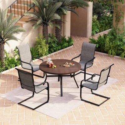 - Wipe clean with the wet cloth and mild soap or hose down with water. Do not use harsh chemicals such as ammonia, bleach, and degreasers. 5 years guaranteed with thicker steel tube,longer diameter and double powder-coated finish, much more solid and sturdy than other normal patio dining table set, definitely ensure the durability and high grade quality.