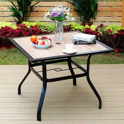 This 5-Piece Outdoor Dining Set is a perfect addition to your patio area, balcony or poolside. This set includes four hand-weaved rattan chairs and a large square table with umbrella hole. Designed for style and built to last, this outdoor dining set features a durable charcoal black powder coated finish that will weather the harshest of outdoor conditions.