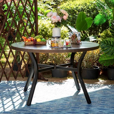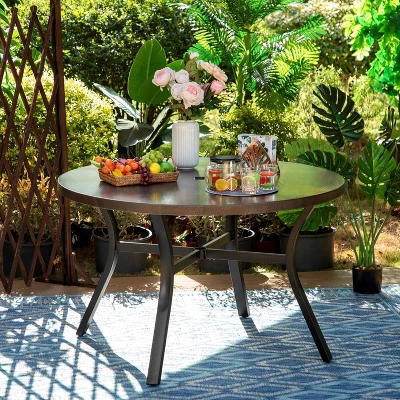 The round metal outdoor dining table wears a rustic and attractive look. It is elaborately hand painted. Its large table top is faux woodgrain finished which is durable, water and weather resistant. The special table features X-crossed legs and adjustable screws that offers extra stability and durability.