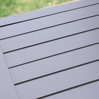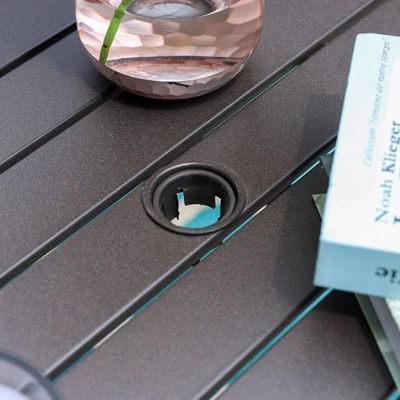 Stylish modern metal slat design makes the table sturdy and polished elegantly, easy to assemble. 1.57″ umbrella hole fits most umbrellas;
