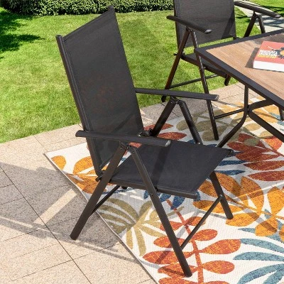 CAPTIVA DESIGNS these premium chairs are made with durable aluminum frames with black textilene fabric. Lightweight and weather-resistant. Ergonomic high back design and 7 adjustable lever help provide the perfect balance between hard and soft surfaces for optimum comfort. No assemble need and folded down for easy transportation, storage. The set coming with a steel frame and wood like top square patio dining table which is durable, easy to clean and fits for most outdoor umbrellas.