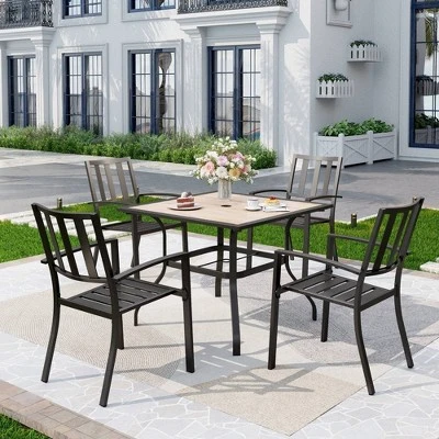 [CAPTIVA DESIGNS] Upgrade your outdoor dining with our 5pc Patio Set with steel square table & armrest chairs. The robust black steel dining table features a wood-like tabletop, seating for four, and an umbrella hole.The STACKABLE chairs provide exceptional comfort for dining and conversation, featuring complete steel construction and a stylish stripe back design. Crafted from E-coating and powder-coated steel frame, it’s both sturdy and durable, making it suitable for any outdoor setting. Resistant to rust, weather, and fading, it is suitable for indoors and outdoors, with easy assembly and maintenance for hassle-free enjoyment.