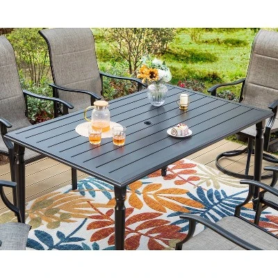 7-piece Patio Dining Set: Weather-resistant 3-layer padded sling fabric seating over durable steel frames makes a handsome addition to any outdoor space.