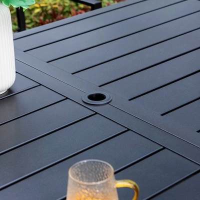 [CAPTIVA DESIGNS] Transform your outdoor dining experience with our 7pc Outdoor Rectangular Table & 6 Chairs set, designed for enduring durability and style. Crafted from e-coated steel tubes, this ensemble is built to withstand the elements, guaranteeing long-lasting durability in any weather. Its sleek modern design, featuring an extra-wide slatted table and ergonomic chair design, offers both style and comfort. The table accommodates most umbrellas with its 1.57″ umbrella hole, providing shade on sunny days.Assembly is a breeze, and maintenance is simple with easy cleaning. Versatile for both outdoor and indoor settings, this set is perfect for family dinners, gatherings, and parties, offering enduring quality and sophistication in a sleek black finish.