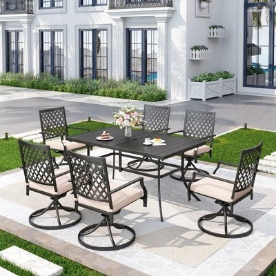 [CAPTIVA DESIGNS] Elevate your dining experience with our 7pc Patio Dining Set. This set includes a black steel table with a 1.57″ umbrella hole, accommodating up to 6 seats in an elegant and comfortable fashion. The swivel armchairs with padded cushions and stylish mesh-style chair backs offer both dining and conversation seating, ensuring maximum comfort. Crafted from E-coating and powder-coated metal frame, it’s both sturdy and durable, making it suitable for any outdoor setting. It is designed to make your dining moments memorable.FEATURES