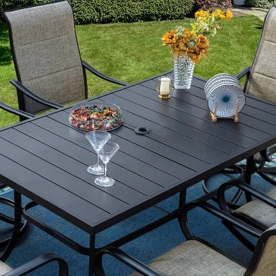 This black steel table offers comfy feeling when it serves as a dining table from Captiva Designs.It accommodates 6 seats around.The steel metal is powder-coated and strong enough for a long time serving.There is a 2.6″ hole for the umbrella.Classic pattern design gives elegant and beautiful look.It is a perfect choice for outdoor and indoor applying.