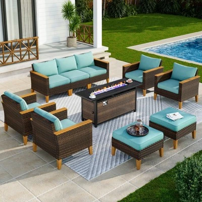 DescriptionElevate your family gatherings with our 10-piece outdoor furniture set. Crafted from durable hand-woven rattan, it effortlessly withstands changing weather. The brown rattan paired with beige/blue cushions not only looks stylish but also provides a cozy seating experience. Perfect for chilly nights, the fire table offers both warmth and atmosphere, making it an ideal choice for enjoying your outdoor space throughout the year. Ideal for poolside, garden, or courtyard settings, our outdoor furniture is your perfect companion for countless enjoyable moments. Features: