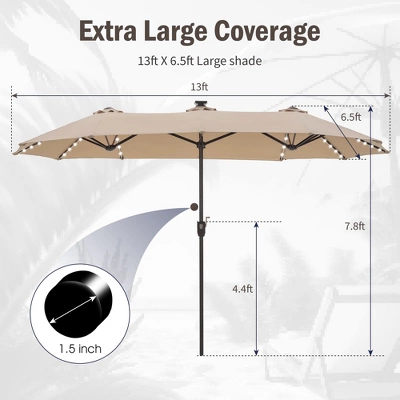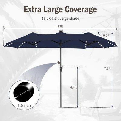 Elevate your outdoor experience with the 13ft Large Double-Sided Patio Umbrella, designed to provide generous shade while adding a stylish touch to any space. Its robust construction ensures stability and durability, making it ideal for both home and commercial use. The water-resistant, UV protective canopy is crafted from 100% polyester, ensuring easy maintenance and lasting performance season after season. Available in three eye-catching colors—Red, Beige, and Navy Blue—you can effortlessly match this umbrella to your outdoor decor. Enjoy gatherings with family and friends in comfort, knowing you have ample protection from the sun!