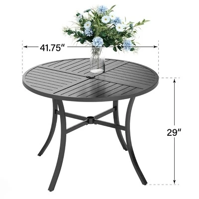 [CAPTIVA DESIGNS] Elevate your outdoor dining experience with our Spacious 42.0″ Round Patio Dining Table, which is designed to accommodate up to 4 guests comfortably. Its stylish slat tabletop not only adds an elegant touch to your outdoor space but also makes maintenance a breeze. For those sunny days, the table comes equipped with a 1.57″ diameter umbrella hole, allowing you to create a shaded oasis while you enjoy your meals. The sturdy cross leg connectors enhance stability, ensuring the table stands strong in any setting. Crafted from E-coated and powder-coated steel, it boasts a robust and long-lasting build designed to withstand the elements, ensuring countless memorable moments outdoors.FEATURES