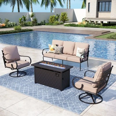 Create a stylish and inviting outdoor retreat with this modern sofa set. The sleek black metal frame features a distinctive open-back design with elegant curve patterns for a sophisticated look. The wide and deep seats, paired with cushions that offer both support and comfort, provide an ideal space for long, relaxing outdoor moments. Ideal for cozy evenings, the fire table with adjustable flame provides both heat and ambiance, making it perfect for year-round use. Crafted with high-quality, weather-resistant materials, this set is designed to withstand the elements, offering lasting beauty and durability season after season.