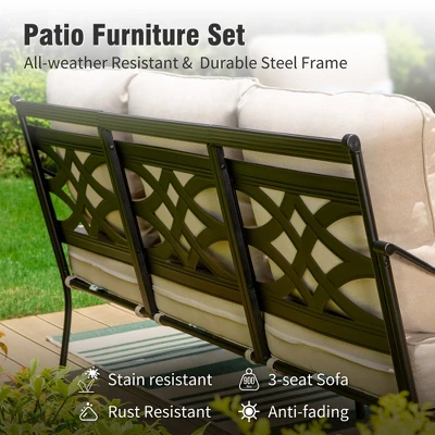 - Stylish Outdoor Design: Sleek all-black metal frame with a elegant patterned backrest for style and breathability. With a deep seat for ample space and a 35.4″ high backrest, our patio sofa offers relaxation for whether a peaceful moment alone or a family gathering.