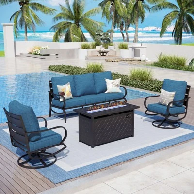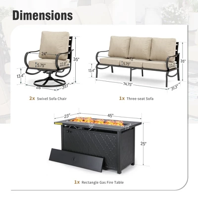 CSA Certified Fire Pit Table: 50,000 BTU stainless steel burner with integrated ignition provides a powerful flame. When not in use, the removable lid transforms it into a coffee table. Compatible with a standard 20lb propane tank (not included).Sturdy All-Metal Frame: Constructed with a robust full steel frame, each seat supports up to 350 lbs. The dual-layer e-coating and powder coating ensure superior rust resistance, durability, and long-lasting performance.Luxurious Cushions: The 5.75″ thick cushions are filled with 28D non-phenol foam, offering exceptional support and resilience for lasting comfort. The back cushions provide excellent lumbar support, making it perfect for hours of relaxation.Cushion Pro® Technology: The 230g olefin patented fabric covers are waterproof, oil-resistant, and stain-resistant, making them easy to clean and maintain while ensuring long-term durability in all weather conditions.Spacious & Deep Seat Structure: With 24″ x 24″ seat cushions and a 72″ wide 3-seater bench, this set provides ample seating space. Designed to support up to 900 lbs, it combines strength and durability for ultimate comfort.Innovative Swivel Chair Design: The armchairs allow 360° swivel and gentle back-and-forth motion, offering a more relaxed alternative to traditional seating and enhancing the overall outdoor lounging experience. Description: