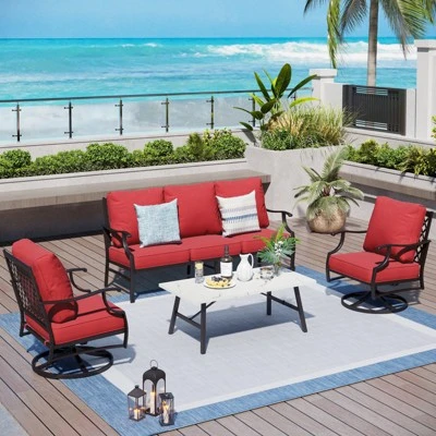Enhance your outdoor sanctuary with this stylish and modern sofa set. The sleek black metal frame and diamond-patterned open-back design provide a sophisticated touch. Enjoy spacious, deep seating with cushions that offer both support and relaxation for extended lounging. The 360° swivel chair adds flexibility, making it easy to adjust for the best views or join in conversations. Constructed with durable, weather-resistant materials, this set is built to endure all seasons, providing lasting beauty and comfort in your outdoor space.