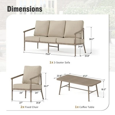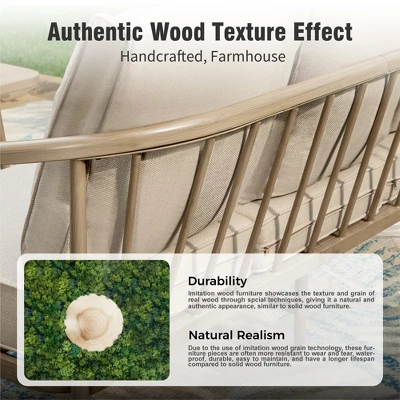 Inspired by the timeless Windsor chair design, this outdoor sofa set features a distinctive comb back, “steam bent” bow armrests, and splayed legs, blending classic craftsmanship with contemporary elegance. The gentle hand-brushed wood-grain finish enhances the vintage charm, making this set a perfect addition to any outdoor space. Generously sized seats paired with plush cushions provide the ultimate comfort for relaxation, while the high-quality fabric and dual-layer protective metal coating ensure durability and easy maintenance. A refined choice for those seeking both style and practicality in their outdoor living areas.