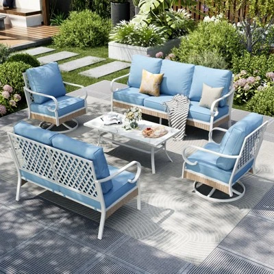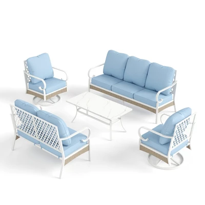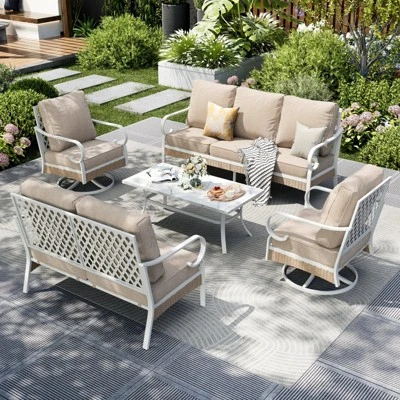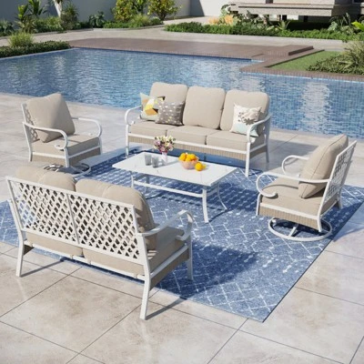 - Well-Designed Configuration: Includes a 3-seat sofa, a loveseat, two swivel armchairs, and a coffee table, offering flexible seating and surface space for any gathering.