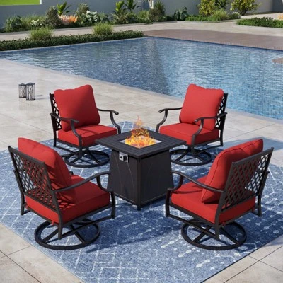 Enhance your outdoor sanctuary with this stylish and modern sofa set. The sleek black metal frame and diamond-patterned open-back design provide a sophisticated touch. Enjoy spacious, deep seating with cushions that offer both support and relaxation for extended lounging. The 360° swivel chair adds flexibility, making it easy to adjust for the best views or join in conversations. The adjustable flame gas fire table creates a warm and inviting atmosphere, perfect for cozy evenings. Constructed with durable, weather-resistant materials, this set is built to endure all seasons, providing lasting beauty and comfort in your outdoor space.