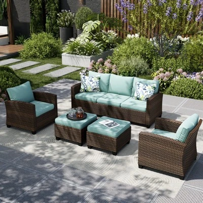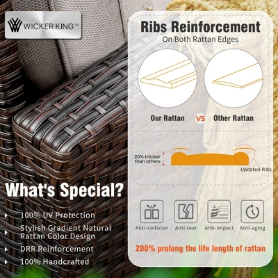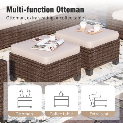 Stylish & Comfortable Sofa Set: Modern design fits any outdoor space. 4″ thick cushions with 28D high-density foam, plus a supportive backrest and ergonomic curved armrests, offer ultimate comfort for relaxation.Weather-Resistant & Durable: High-performance, handwoven PE rattan is designed to withstand fading, cracking, and the elements. The steel frame features E-Coating and Powder-Coating for superior rust and wear resistance, ensuring long-lasting use.Waterproof & Low-Maintenance Cushions: CUSHION PRO technology fabric offers waterproof, anti-soiling, and UV-resistant properties. Easy-to-remove covers with zippers make cleaning a breeze, keeping the set looking fresh through all seasons.Versatile Ottoman: This cushioned ottoman serves multiple purposes – as a comfortable footrest, extra seating, or even a convenient side table for placing items, making your outdoor relaxation time more practical and enjoyable.Modular Design for Custom Layouts: Tailor the setup to fit your outdoor space perfectly. Each module supports up to 350 lbs, offering flexible seating options to create the ideal arrangement for your needs.