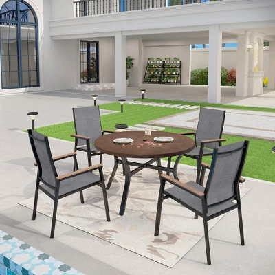 Elevate your outdoor dining with this dining set. The included durable steel frame table is equipped with an umbrella hole for added shade options. Our Aluminum Patio Arm Chairs with Wooden Armrests are stackable Gray sling chairs designed with breathable fabric and a sturdy yet lightweight aluminum frame. They beautifully combine comfort, style, and space-saving convenience for both indoor and outdoor settings. Elevate your patio, porch, or backyard with this stylish and durable dining set, perfect for entertaining family and friends!
