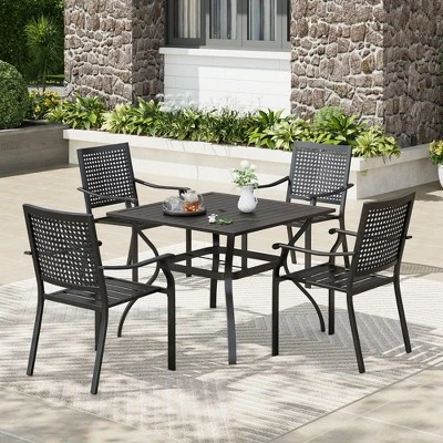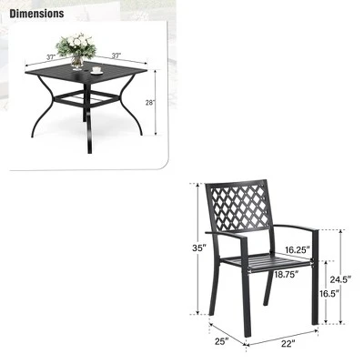 [CAPTIVA DESIGNS] Enhance your outdoor experience with our 9-piece dining set. The generous square metal table features a slatted top and a 1.57″ umbrella hole for added convenience and UV protection. Eight stackable metal chairs feature a unique perforated backrest, providing a comfortably cozy seating experience. Crafted from E-coating and powder-coated steel frame, this durable set seamlessly blends style, function and durability, making it the perfect choice for your outdoor dining needs. Enjoy stylish and comfortable gatherings with this versatile dining set!FEATURES