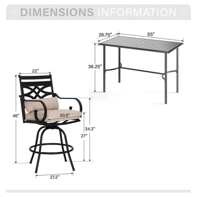 [CAPTIVA DESIGNS] Enhance your outdoor gatherings with our spacious Large Bar Height Table, designed for 4-6 people and crafted from durable all-metal steel with an elegant embossed design. Paired with 360-Degree Swivel Stools, featuring extra-wide seats and soft, weather-resistant cushions, you’ll enjoy optimal comfort and mobility while socializing. Built with an E-coating and powder-coated frame, this robust furniture set is made to withstand the elements, ensuring lasting enjoyment in your outdoor space.FEATURES