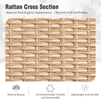 Highlight:Unique Design: White frame with neutral cushions and light brown rattan accents creates a fresh, warm look. Diamond-patterned backrest and marble-like metal table add sophistication.Luxurious Thick Cushions: 5.75″ ultra-thick cushions with 28D non-phenol foam offer lasting comfort and support, with no sagging over time.All-Weather Heavy-Duty Frame: Sturdy wrought iron frame supports up to 350 lbs per chair, with E-coating and powder-coating for durability and easy maintenance.Advanced Cushion Fabric: CUSHION PRO fabric is waterproof, oil-resistant, and easy to clean. Velcro secures cushions in place during use.Well-Designed Configuration: Includes a 3-seat sofa, two swivel armchairs, two fixed armchairs, and a coffee table, offering flexible seating and surface space for any gathering. Description:Transform your outdoor space into a luxurious retreat with this beautifully designed sofa set. The fresh white frame pairs effortlessly with elegant neutral tones, while the metal frame is complemented by realistic woven rattan for a natural, upscale feel. With ultra-thick cushions, oversized seats, and ergonomically angled backrests, this set ensures comfort during extended outdoor relaxation. Crafted from weather-resistant materials, it’s easy to maintain and will retain its beauty for years to come. Perfect for creating a serene and stylish outdoor oasis. Specifications: