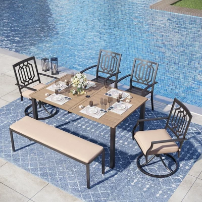 [CAPTIVA DESIGNS] Upgrade your outdoor dining with our 7pc Patio Dining Set, which features a premium metal frame and wood-like tabletop with a 1.57″ umbrella hole. The table offers a rustic look with a durable faux woodgrain finish.The STACKABLE chairs provide exceptional comfort for dining and conversation, featuring complete steel construction and a stylish stripe back design. Crafted from E-coating and powder-coated steel frame, this durable set seamlessly blends style, function and durability, making it the perfect choice for your outdoor dining needs. Elevate your outdoor space effortlessly with this stylish, comfortable, and durable dining set.