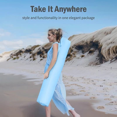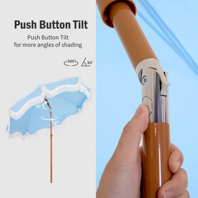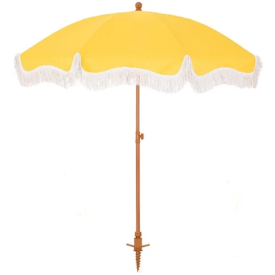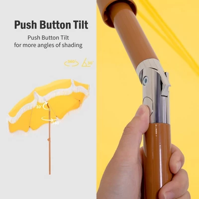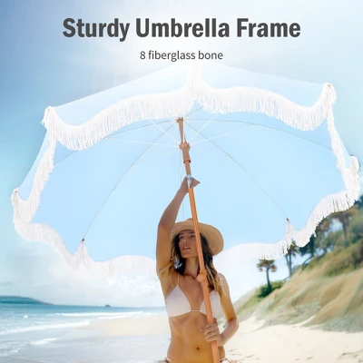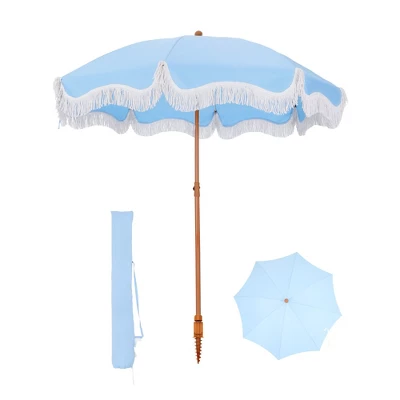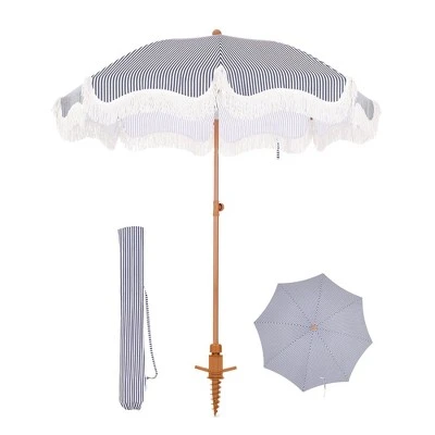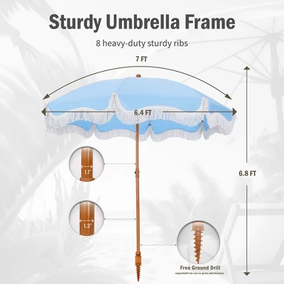 [CAPTIVA DESIGNS]Enjoy the perfect combination of style and functionality with our 7ft Portable Patio Umbrella, featuring elegant fringes and vibrant color options like white and blue stripes, sunset yellow, and sky blue. Built with stability in mind, this umbrella has a durable steel pole and 8 flexible fiberglass ribs, ensuring it remains secure even on breezy days. The high-quality polyester canopy provides UPF 50+ protection, effectively blocking 99% of harmful UV rays while allowing you to adjust its angle for optimal shade coverage. Weighing just 6.6 pounds, it is lightweight and easy to transport, with two parts for simple assembly and a convenient carrying bag. Perfect for the beach or any outdoor occasion, this umbrella adds a touch of elegance to your space while keeping you safe from the sun.Packages Includes: