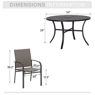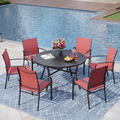 [CAPTIVA DESIGNS] Upgrade your outdoor dining with our 7-Piece Outdoor Dining Set, featuring a spacious 54″ Round Table that comfortably seats 6 guests. The stylish slat tabletop is easy to maintain and includes a 1.57″ umbrella hole for shade on sunny days.These ergonomic breathable sling patio chairs are expertly designed to combine comfort and style. With extra-wide seats, ergonomic backrests, and wide curved armrests, these chairs offer superior comfort for all-day relaxation. Built for all-weather use, the UV-resistant textilene fabric ensures durability and easy maintenance, while each chair supports up to 300 lbs. Crafted from durable E-coated and powder-coated steel with robust cross leg connectors, this set is designed to withstand outdoor conditions for lasting enjoyment.