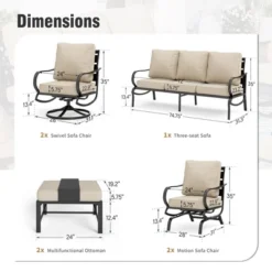 Bring sleek sophistication to your outdoor space with our minimalist all-black metal frame sofa set. The wide and deep seats, combined with supportive yet enveloping back cushions, offer unmatched comfort for long hours of lounging. The rocking single chairs break away from the rigidity of traditional seating, providing a more relaxed, fluid motion. Crafted with high-quality, weather-resistant materials, this furniture set is built to withstand the test of time, ensuring both style and durability for years to come.
