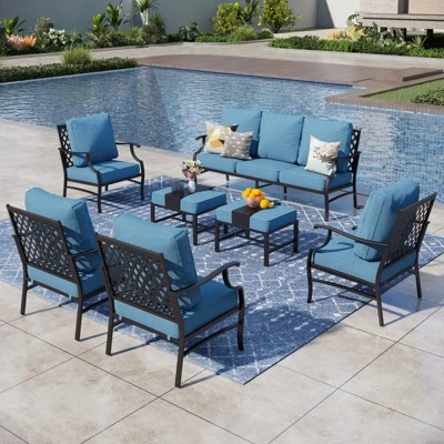 Enhance your outdoor sanctuary with this stylish and modern sofa set. The sleek black metal frame and diamond-patterned open-back design provide a sophisticated touch. Enjoy spacious, deep seating with cushions that offer both support and relaxation for extended lounging. Constructed with durable, weather-resistant materials, this set is built to endure all seasons, providing lasting beauty and comfort in your outdoor space.