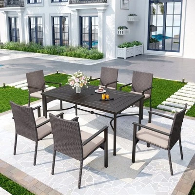 [CAPTIVA DESIGNS] Upgrade your outdoor dining with our 7-Piece Outdoor Dining Set, featuring a spacious 54″ Round Table that comfortably seats 6 guests. The stylish slat tabletop is easy to maintain and includes a 1.57″ umbrella hole for shade on sunny days.Soft, removable cushions add extra comfort, while easy assembly and minimal maintenance make enjoying your outdoor space effortless. Embrace nature’s beauty with selective wicker and premium metal, creating an inviting space for lasting gatherings. Crafted from durable E-coated and powder-coated steel with robust cross leg connectors, this set is designed to withstand outdoor conditions for lasting enjoyment.