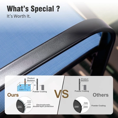 - All-Weather Textilene Fabric: The chairs are equipped with Blue Textilene fabric that is weather-resistant, UV resistant, and easy to clean, ensuring long-lasting quality.