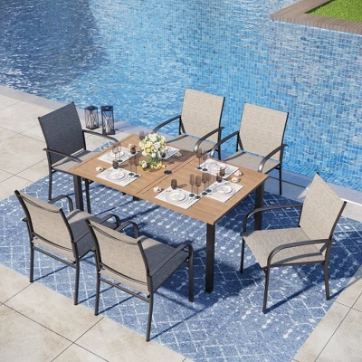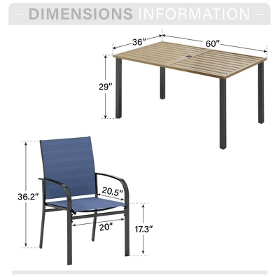 [CAPTIVA DESIGNS] Upgrade your outdoor dining with our 7pc Patio Dining Set, which features a premium metal frame and wood-like tabletop with a 1.57″ umbrella hole. The table offers a rustic look with a durable faux wood-grain finish.Crafted for all-weather use, the Blue sling chairs offer extra-wide 20″ seats, ergonomic backrests, and wide curved armrests for superior comfort. With a 300 lbs weight capacity per chair and easy-to-maintain UV-resistant textilene fabric, it’s both durable and stylish. All of this is supported by a robust double-coated steel frame. Crafted from E-coating and powder-coated steel frame, this durable set seamlessly blends style, function and durability, making it the perfect choice for your outdoor dining needs.