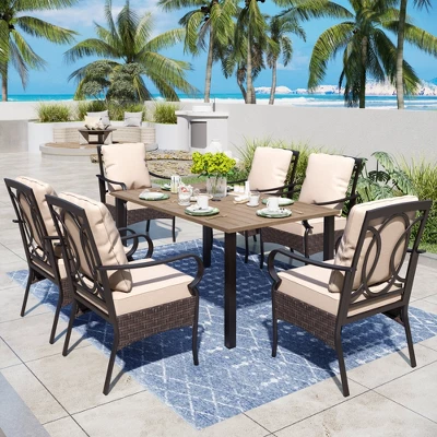 [CAPTIVA DESIGNS] Upgrade your outdoor dining with our 7pc Patio Dining Set, which features a premium metal frame and wood-like tabletop with a 1.57″ umbrella hole. The table offers a rustic look with a durable faux woodgrain finish, a slat tabletop with a steel reinforcement ring beneath its edges.These 360-degree swivel chairs feature thick seat cushions and waist pillows for ultimate comfort, curved armrests for style and ergonomic support, and a sturdy triangle base with three steel bottom brackets for a comfortably cozy seating experience. Crafted from E-coating and powder-coated steel frame, this durable set seamlessly blends style, function and durability, making it the perfect choice for your outdoor dining needs.