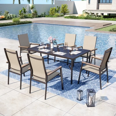 [CAPTIVA DESIGNS] Enhance your dining experience with our Geometric Stamped Rectangle Steel Table, accommodating six guests comfortably. Featuring a convenient 1.77″ umbrella hole for shade, its stylish stamped tabletop adds a modern touch. Durable straight legs provide stability and ample legroom, while sturdy semicircle connectors enhance durability.Paired with STACKABLE Beige sling chairs featuring breathable fabric and a sturdy yet lightweight aluminum frame, this set seamlessly blends comfort, style, and space-saving convenience for both indoor and outdoor settings. Crafted from E-coating and powder-coated metal frame, this durable set seamlessly blends style, function and durability, making it the perfect choice for your outdoor dining needs.
