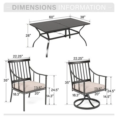 [CAPTIVA DESIGNS] Elevate your outdoor dining experience with our 7-Piece Outdoor Dining Set, featuring a spacious Steel Rectangle Dining Table that comfortably seats 6 guests. This stylish table includes a 1.57″ umbrella hole and a slat tabletop for easy cleaning, all crafted from durable E-coated and powder-coated black steel. The elegant angled legs provide ample legroom, while the chic grooved edges enhance its modern design.Paired with our Spacious Comfort Metal Chair, designed to accommodate all body types with an extra-wide 20.0″ seat and a removable 3.5″ thick cushion for added softness. The stylish slatted design not only enhances the modern aesthetic of your outdoor space but also ensures optimal support and ventilation. Crafted from E-coating and powder-coated steel frame, this durable set seamlessly blends style, function and durability, making it the perfect choice for your outdoor dining needs.
