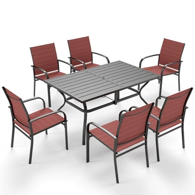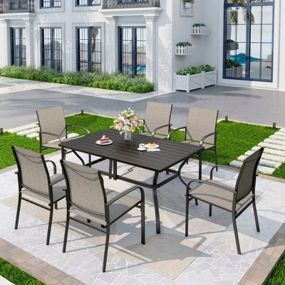 - Complete 7-Piece Dining Set: This versatile set includes a spacious dining table and six comfortable armrest sling chairs, offering ample seating for your outdoor gatherings.