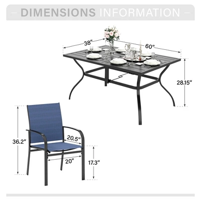 [CAPTIVA DESIGNS] Elevate your outdoor dining experience with our 7-Piece Outdoor Dining Set, featuring a spacious Steel Rectangle Dining Table that comfortably seats 6 guests. This stylish table includes a 1.57″ umbrella hole and a slat tabletop for easy cleaning, all crafted from durable E-coated and powder-coated black steel. The elegant angled legs provide ample legroom, while the chic grooved edges enhance its modern design.Crafted for all-weather use, the Blue sling chairs offer extra-wide 20″ seats, ergonomic backrests, and wide curved armrests for superior comfort. With a 300 lbs weight capacity per chair and easy-to-maintain UV-resistant textilene fabric, it’s both durable and stylish. All of this is supported by a robust double-coated steel frame. Crafted from E-coating and powder-coated steel frame, this durable set seamlessly blends style, function and durability, making it the perfect choice for your outdoor dining needs.