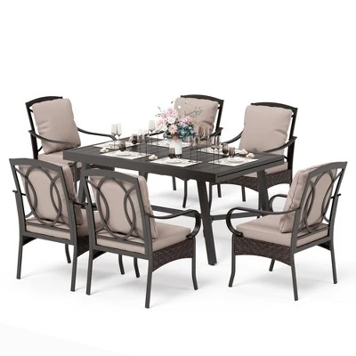 [CAPTIVA DESIGNS] Elevate your outdoor dining experience with our 7-Piece Outdoor Dining Set, featuring a spacious Steel Rectangle Dining Table that comfortably seats 6 guests. This stylish table includes a 1.57″ umbrella hole and a slat tabletop for easy cleaning, all crafted from durable E-coated and powder-coated black steel. The elegant angled legs provide ample legroom, while the chic grooved edges enhance its modern design.These all-weather wicker swivel chairs feature thick seat cushions and waist pillows for ultimate comfort, curved armrests for style and ergonomic support, and a sturdy triangle base with three steel bottom brackets for a comfortably cozy seating experience. Crafted from E-coating and powder-coated steel frame, this durable set seamlessly blends style, function and durability, making it the perfect choice for your outdoor dining needs.