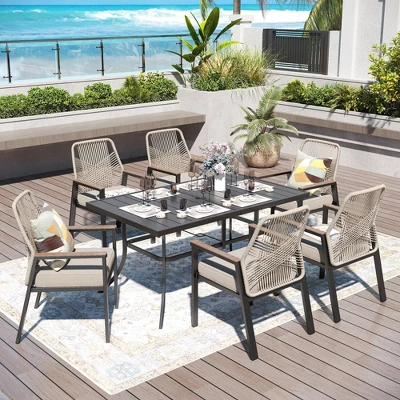 [CAPTIVA DESIGNS] Upgrade your outdoor dining with our 7pc Patio Dining Set. The Expandable Table accommodates 6 – 8 people for versatile gatherings, featuring a chic Slat Tabletop for easy cleaning and Spacious Straight Table Legs for comfort.These stylish and durable outdoor chairs feature hand-woven weather-resistant rattan, a spacious 23.4″ seat with ergonomic backrest, 3.1″ thick cushions for exceptional comfort and support up to 300 lbs, all-weather cushions with easy maintenance, and elegantly designed wood-like armrests for a touch of natural charm. Crafted from E-coating and powder-coated steel frame, this durable set seamlessly blends style, function and durability, making it the perfect choice for your outdoor dining needs.