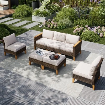Elevate your family gatherings with our 7-piece outdoor furniture set. Crafted from durable hand-woven rattan, it effortlessly withstands changing weather. The brown rattan paired with beige cushions not only looks stylish but also provides a cozy seating experience. Ideal for poolside, garden, or courtyard settings, our outdoor furniture is your perfect companion for countless enjoyable moments.