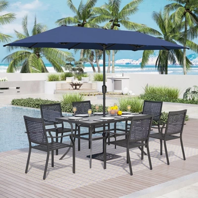 - Complete 8-Piece Dining Set: This versatile set includes a spacious dining table, six comfortable armrest metal chairs, and 1 blue market umbrella, offering ample seating for your outdoor gatherings.