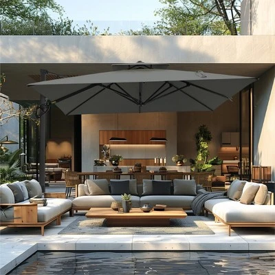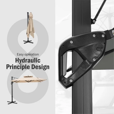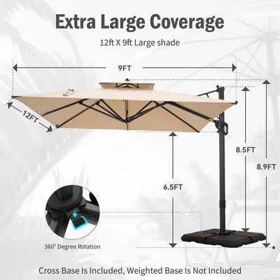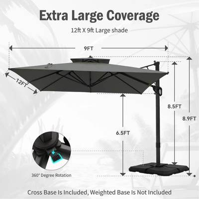 Transform your outdoor living area with our 9 ft x 12 ft Premium Cantilever Patio Umbrella. This beautifully designed umbrella combines elegance with practicality, featuring a sturdy triangular structure and a unique double-top design that provides outstanding stability and airflow. Perfect for enhancing patios, gardens, and poolside settings, it delivers ample shade while adding a touch of sophistication to your outdoor environment.