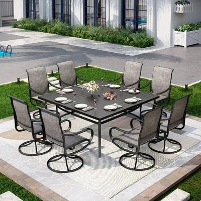 [CAPTIVA DESIGNS] Enhance your outdoor dining experience with our 9pc set. The 60.0″ x 60.0″ square metal table, with a 1.57″ umbrella hole, offers ample dining space and easy cleaning with its slatted top. The breathable quick-dry Grayish Brown sling chairs swivel 360 degrees, adding convenience and comfort. U-curve armrests and a sturdy steel frame provide stability, and rust resistance ensures long-lasting use. Experience a wonderful outdoor lifestyle transformation that you’ll cherish.FEATURES