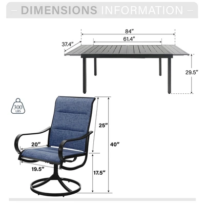 [CAPTIVA DESIGNS] Upgrade your outdoor dining with our 9pc Patio Dining Set. The Expandable Table accommodates up to 8 people for versatile gatherings, featuring a chic Slat Tabletop for easy cleaning and Spacious Straight Table Legs for comfort.The breathable Padded Blue sling chairs swivel 360 degrees, adding convenience and comfort. U-curve armrests and a sturdy steel frame provide stability, and rust resistance ensures long-lasting use. Crafted from E-coating and powder-coated steel frame, this durable set seamlessly blends style, function and durability, making it the perfect choice for your outdoor dining needs.