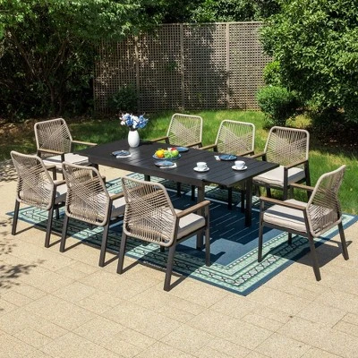 [CAPTIVA DESIGNS] Upgrade your outdoor dining with our 9pc Patio Dining Set. The Expandable Table accommodates up to 8 people for versatile gatherings, featuring a chic Slat Tabletop for easy cleaning and Spacious Straight Table Legs for comfort.These stylish and durable outdoor chairs feature hand-woven weather-resistant rattan, a spacious 23.4″ seat with ergonomic backrest, 3.1″ thick cushions for exceptional comfort and support up to 300 lbs, all-weather cushions with easy maintenance, and elegantly designed wood-like armrests for a touch of natural charm. Crafted from E-coating and powder-coated steel frame, this durable set seamlessly blends style, function and durability, making it the perfect choice for your outdoor dining needs.
