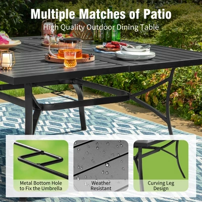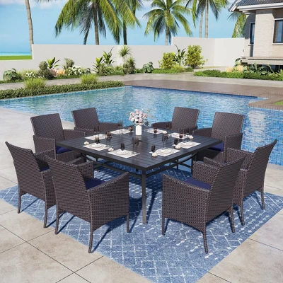 [CAPTIVA DESIGNS] Enhance your outdoor experience with our 9-piece dining set designed with a robust double-coated metal frame. The generous square metal table features a slatted top and a 1.57″ umbrella hole for added convenience and UV protection. Soft, removable cushions add extra comfort, while easy assembly and minimal maintenance make enjoying your outdoor space effortless. Embrace nature’s beauty with selective wicker and premium metal, creating an inviting space for lasting gatherings. Enjoy stylish and comfortable gatherings with this versatile dining set!FEATURES