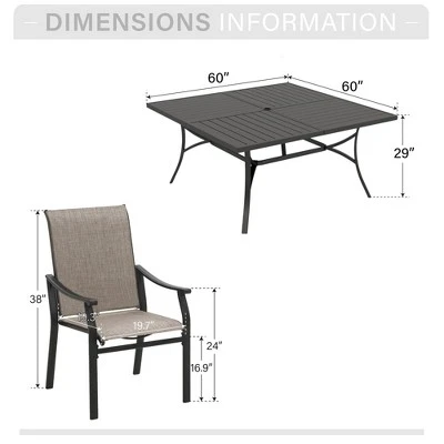 [CAPTIVA DESIGNS] Enhance your outdoor experience with our 9-piece dining set designed with a robust double-coated metal frame. The generous square metal table features a slatted top and a 1.57″ umbrella hole for added convenience and UV protection.These ergonomic breathable sling patio chairs are expertly designed to combine comfort and style. With extra-wide 19.7″ seats, ergonomic backrests, and wide waved armrests, these chairs offer superior comfort for all-day relaxation. Built for all-weather use, the UV-resistant textilene fabric ensures durability and easy maintenance, while each chair supports up to 300 lbs. Enjoy stylish and comfortable gatherings with this versatile dining set!
