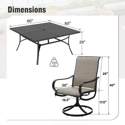 Enhance your outdoor dining with our 9pc Patio Dining Set. The spacious 60 inches x 60 inches square metal table features a slatted top that prevents water accumulation for easy maintenance. Equipped with a 1.57 inches pre-cut umbrella hole for UV protection, this table combines functionality and style. The Crafted from durable E-coated and powder-coated steel, this set ensures long-lasting enjoyment, while fixed ring connections provide exceptional stability. Transform your patio or backyard into an inviting space with this versatile dining table!